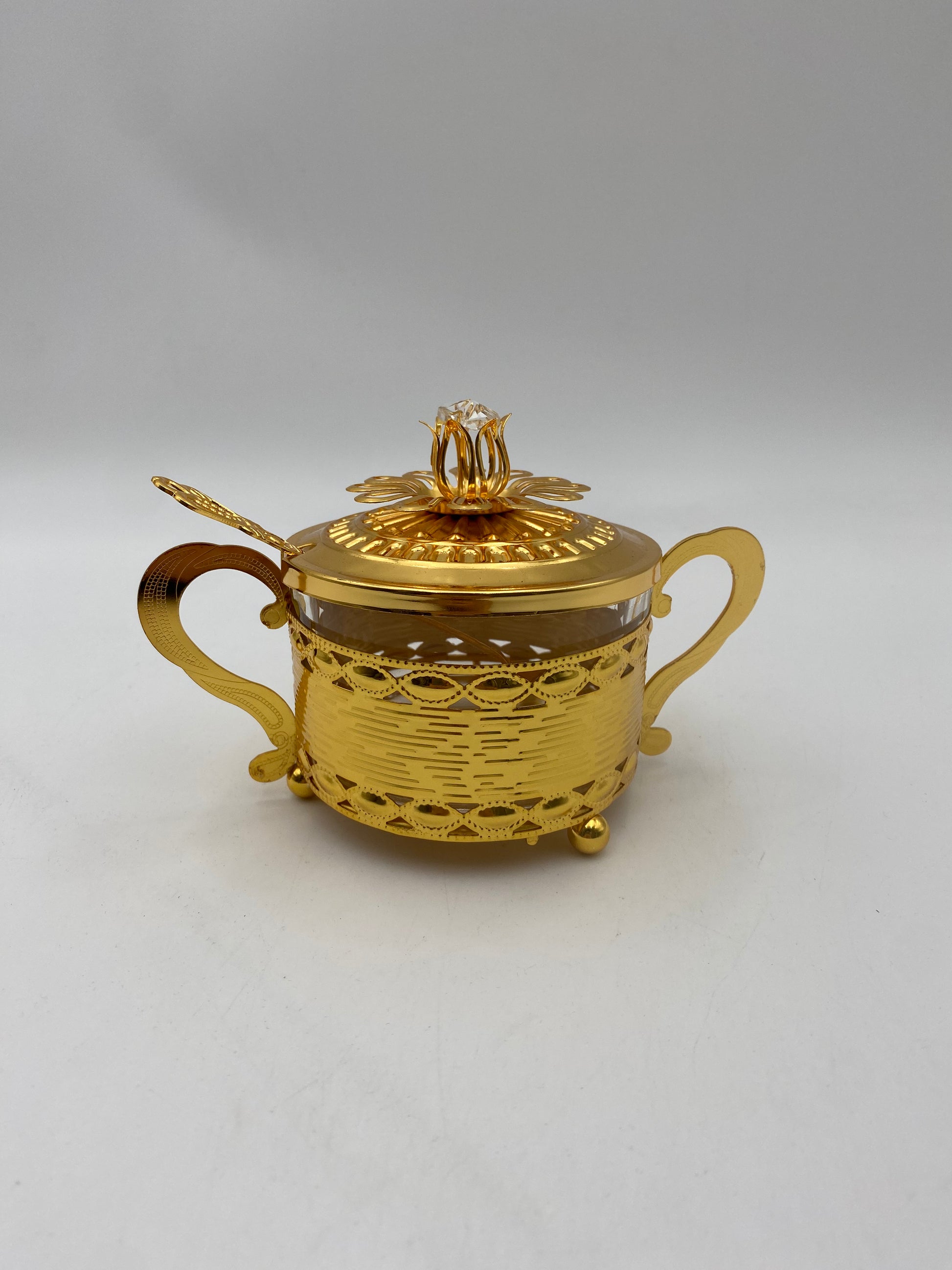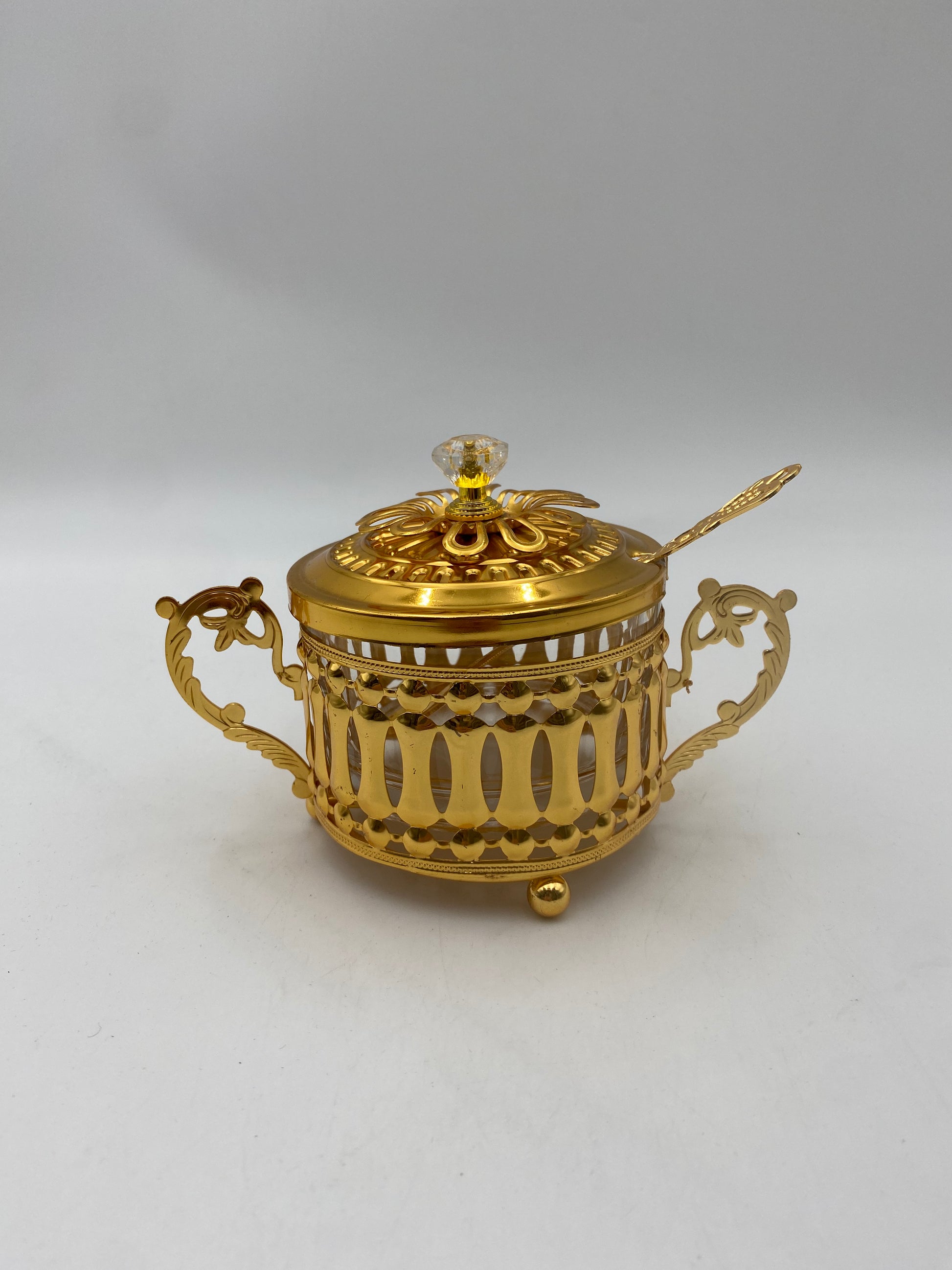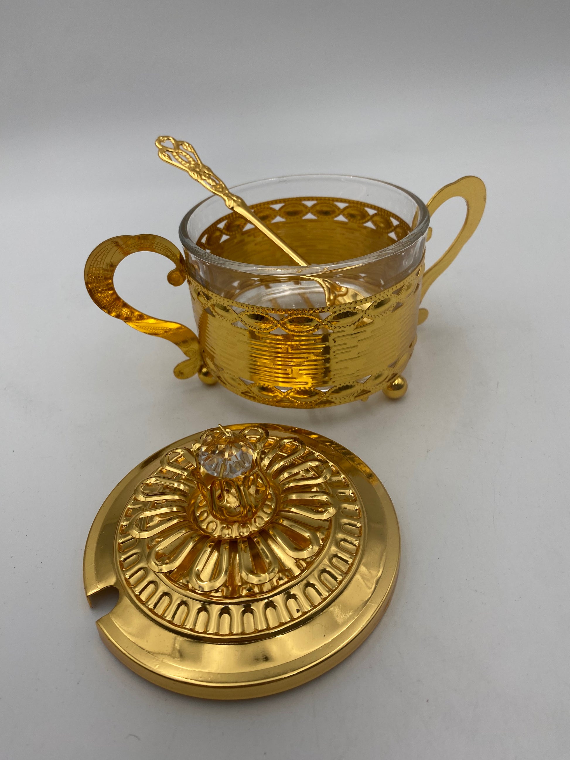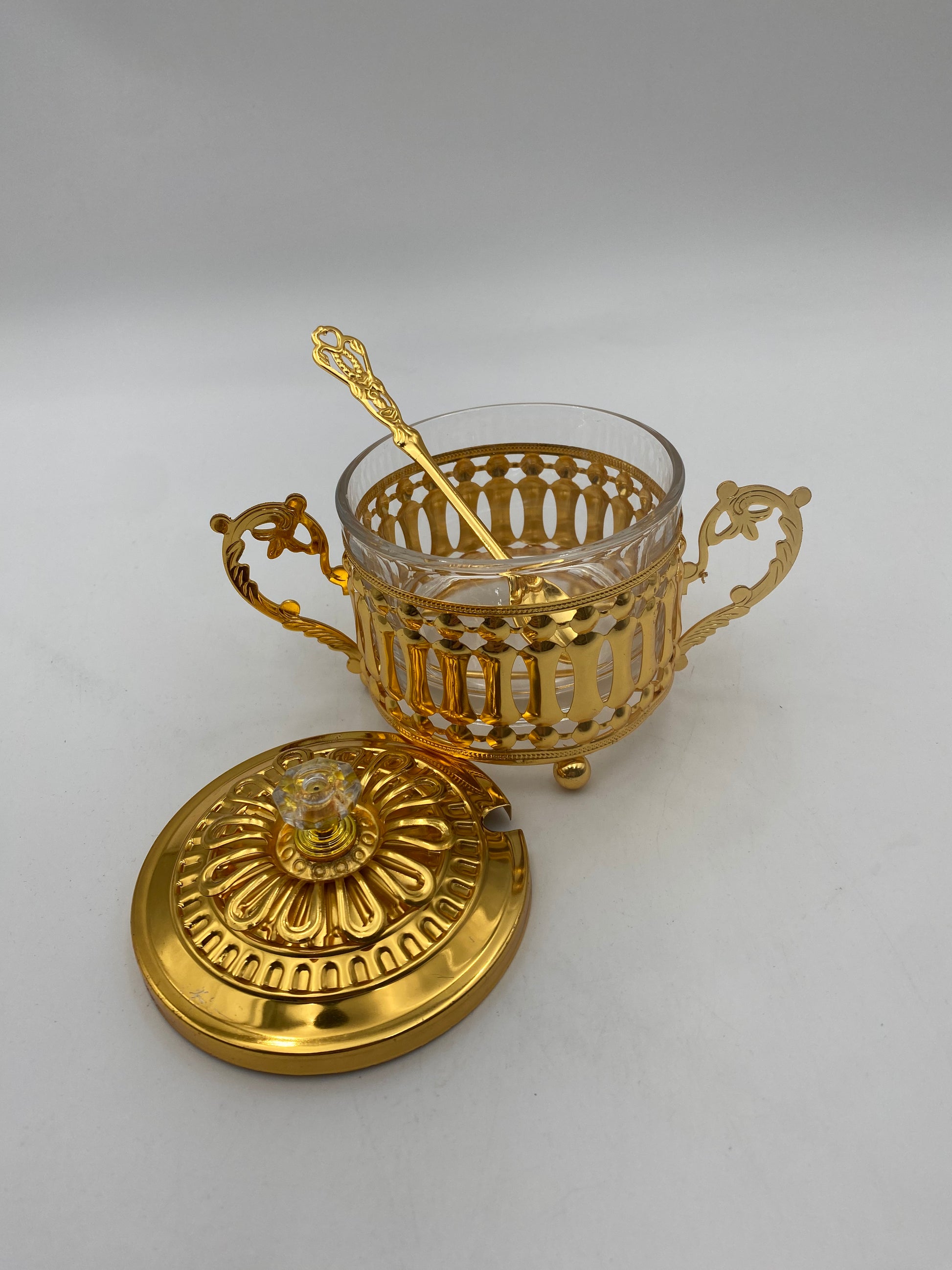 Glass Sugar Bowl Metal Golden Patterned W/ Golden Spoon