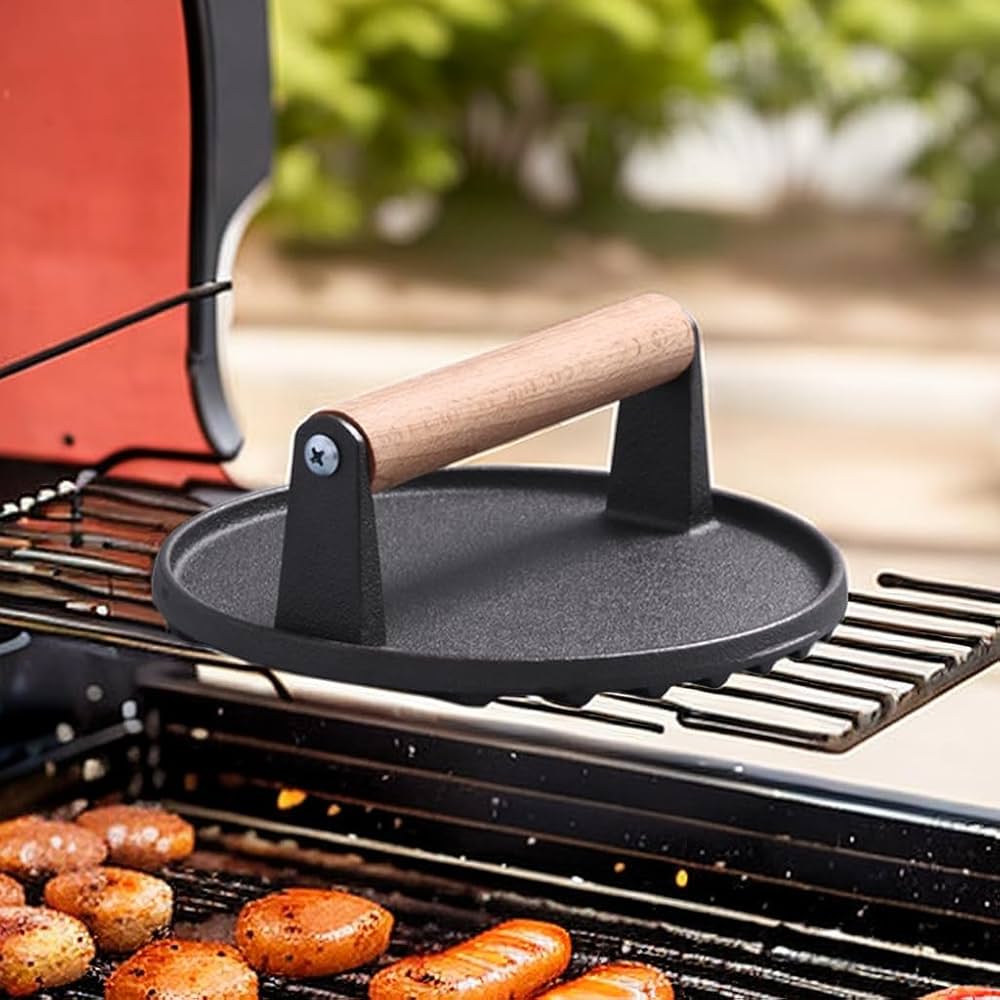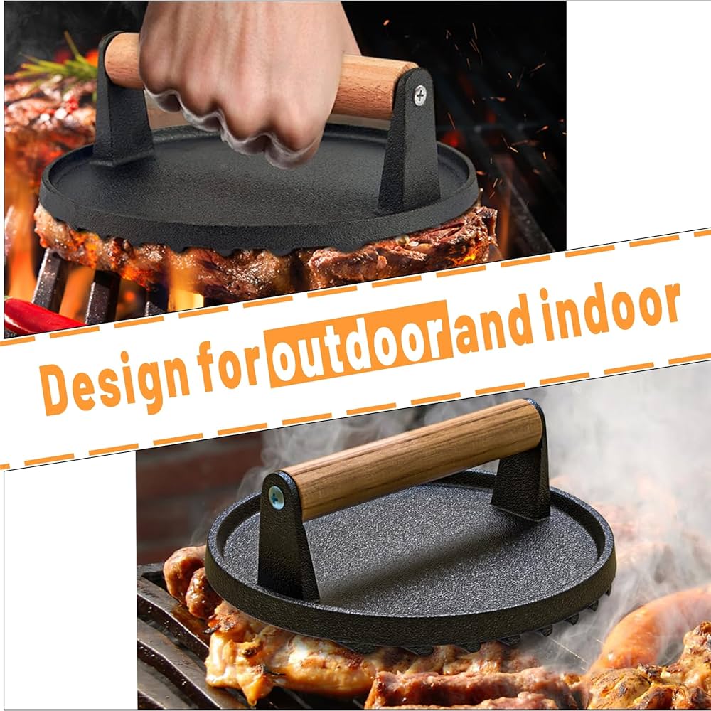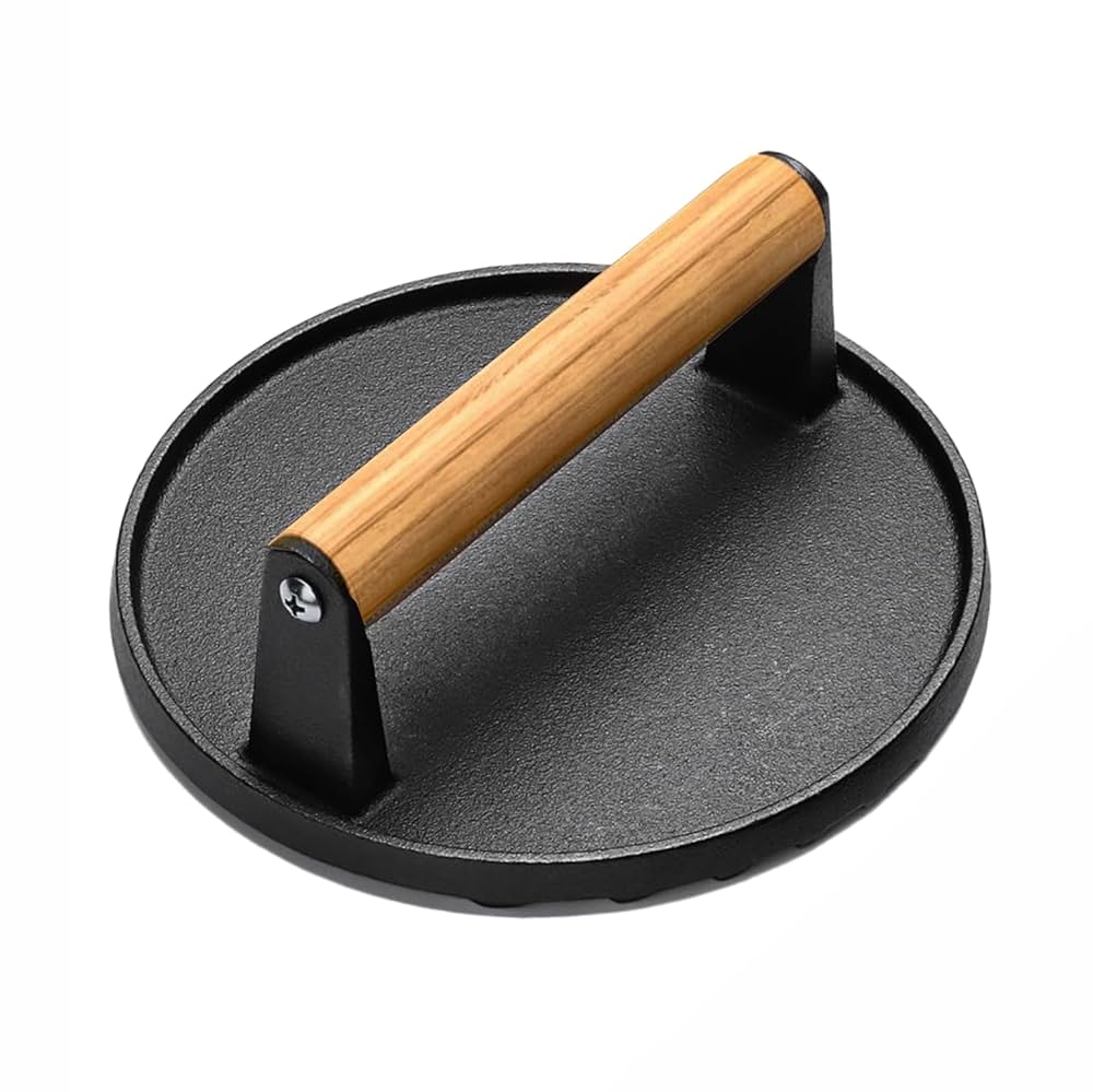 - 【HEAVY-DUTY & HEAT RESISTANT】 :Our barbeque hamburger press is made of heavy duty food grade cast iron with heat resistant wooden handle. Create perfectly smashed burgers with our heavy-duty cast iron food grade press, designed for usinng on griddles and blackstone grills.